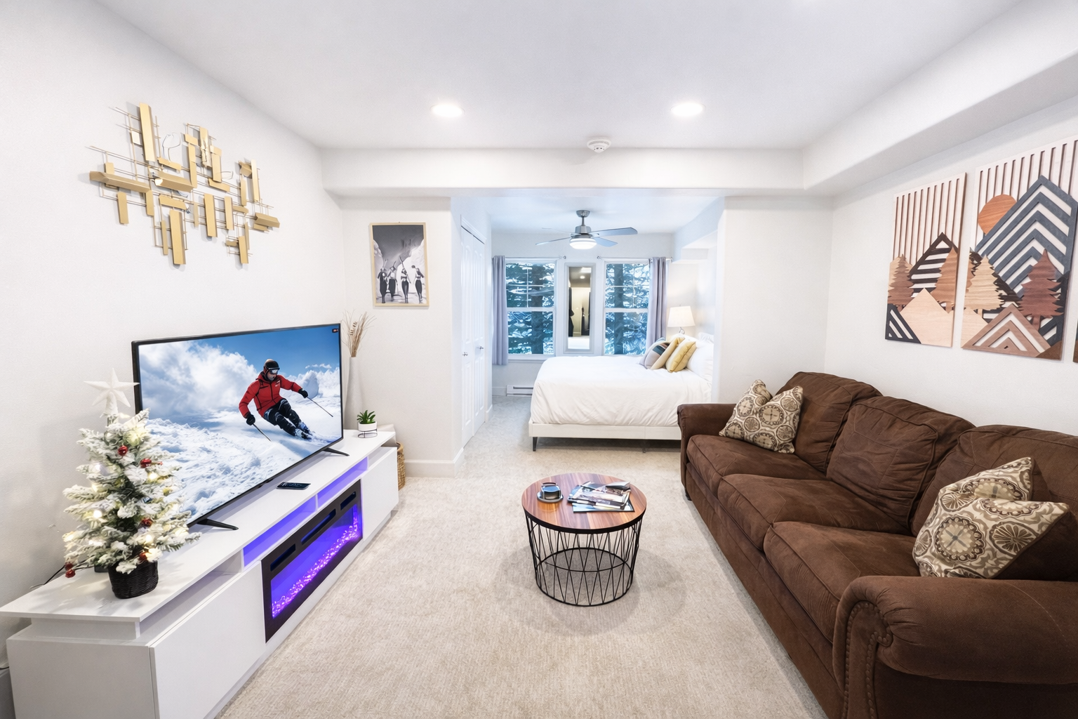You'll have access to top-notch amenities, including the Trailhead Gondola, which takes you directly to the base of the mountain during ski season. You'll also have use of a deluxe spa facility at the Trailhead Lodge, featuring three outdoor hot tubs, a saltwater pool, fire pits, and a game room. Inside the studio, you'll find a lovely open living room and kitchen concept, complete with everything you need to cook your own meals.
